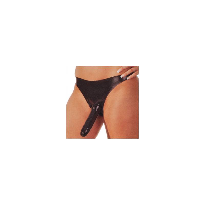 Slip de látex negro, elástico, talla única, con dildo externo de látex negro.