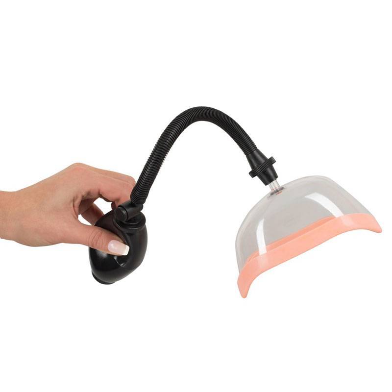 Boquilla de succión de plástico transparente con forma anatómica rodeada de una atractiva goma de color carne para un sellado perfecto, conectada a una pera de goma negra mediante un tubo de plástico.