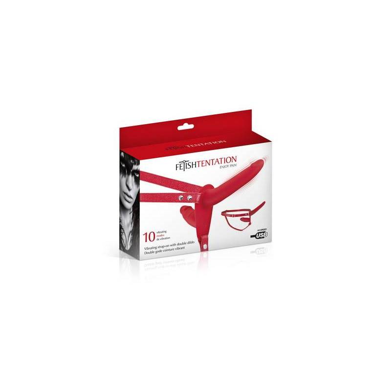 Para aumentar los efectos, este consolador doble cinturón rojo está equipado con 10 velocidades cuyo botón se encuentra discretamente en el interior del cinturón.