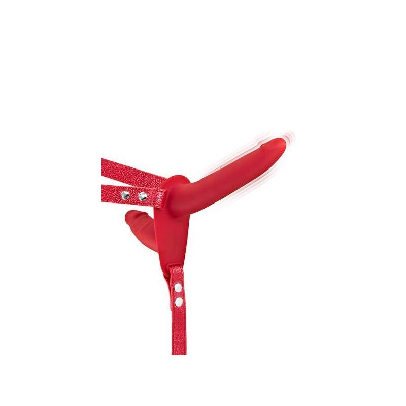consolador doble cinturón vibrador rojo compuesto por un consolador interno y otro externo, con una penetración vibratoria beneficiosa para ambos miembros de la pareja.