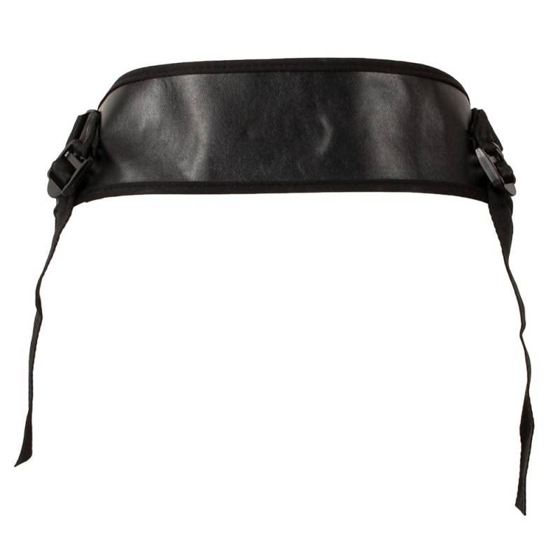 Consolador con cinturón, compuesto por un cinturón de polipiel negra con correas de nylon ajustables, una parte delantera de polipiel con 4 pequeñas lengüetas con broches, un anillo de acero, un consolador vibrador con ventosa que reproduce un pene de color carne con un mando a distancia de velocidad variable con cable.