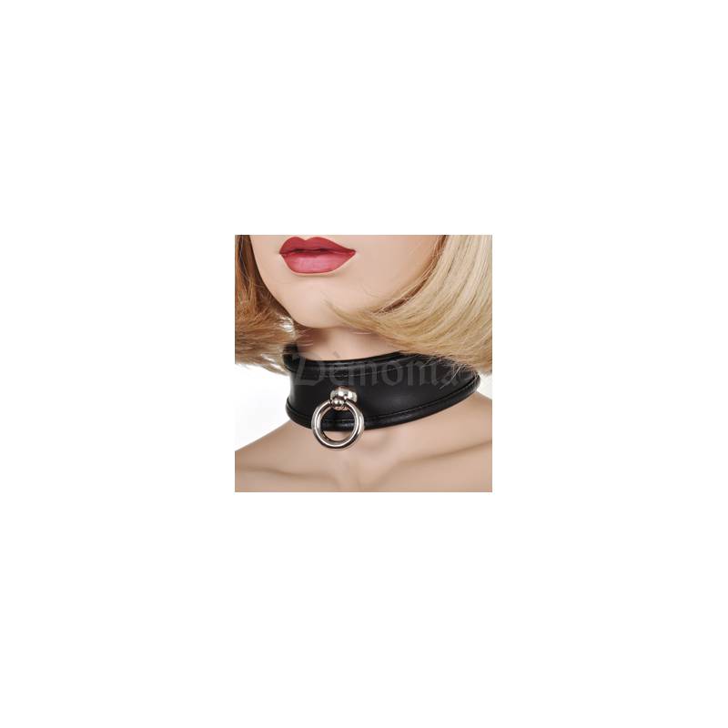 Collar de cuero forrado, con 2 correas remachadas, una hebilla ajustable para cerrarlo y un magnífico anillo de acero cromado.