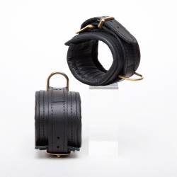 Descubre este elegante par de esposas y su anillo dorado que harán las delicias de tus juegos SMColección Dèmonia Cuero negro Acolchadas y cómodas Anilla dorada 9 posiciones de ajuste
