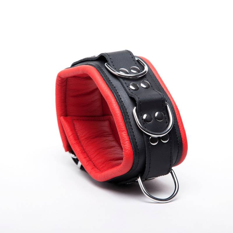 Collar de cuero negro y rojo de alta calidad con 3 anillas metálicas y una correa "sur" remachada, de la"colección Dèmonia".