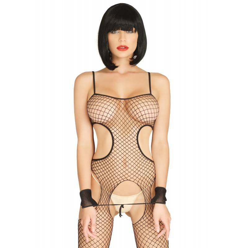 Combinaison de la marque Leg Avenue en résille large ouverte à l'entrejambe, sur les hanches et dans le dos. La combinaison comprend une paire de menottes en résille.