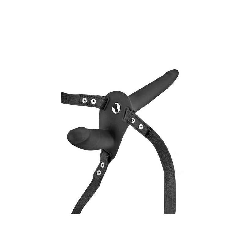 cinturón consolador doble negro y vibrador compuesto por un consolador interno y otro externo, con una penetración vibradora beneficiosa para ambos miembros de la pareja.