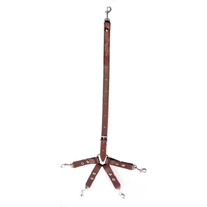 Esta correa de sujeción tiene 5 correas de cuero gruesas, lisas y remachadas, con costuras en los bordes y una anilla metálica en el centro. Una de las correas es mucho más grande que las otras, con una hebilla y orificios para ajustar las dimensiones (10 posiciones diferentes). Esta es la correa que se enganchará a un collar, por ejemplo, para poder ajustarla a la talla del usuario.