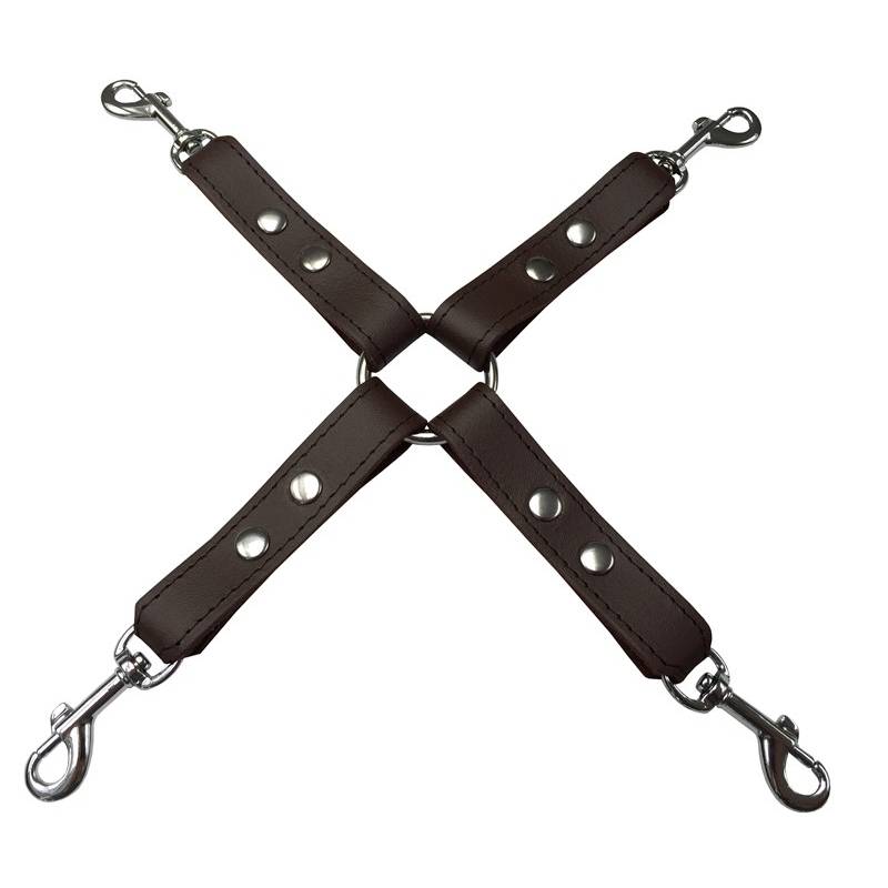 Correa de sujeción en forma de cruz, de cuero marrón de alta calidad con una anilla metálica en el centro y mosquetones en cada extremo, de la"colección Dèmonia".