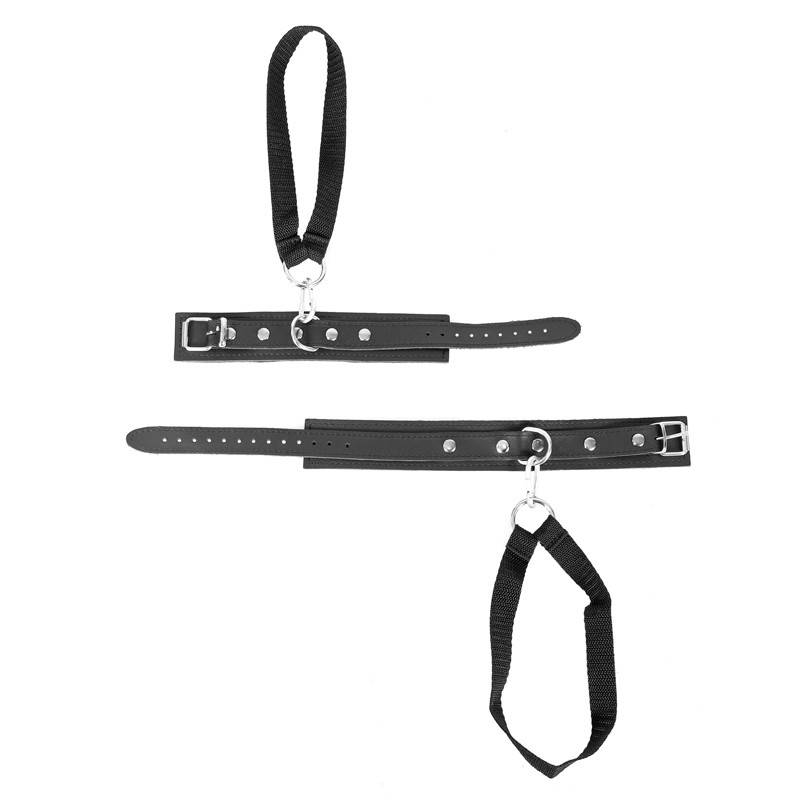 Kit de 2 esposas y 2 tobilleras, cada una con un mosquetón conectado a una correa de nailon para fijarlas a la esquina de una puerta.