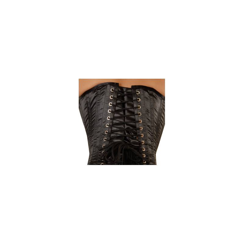 Corsé largo de satén negro, preformado a la altura del pecho y vendido con 6 ligueros desmontables.