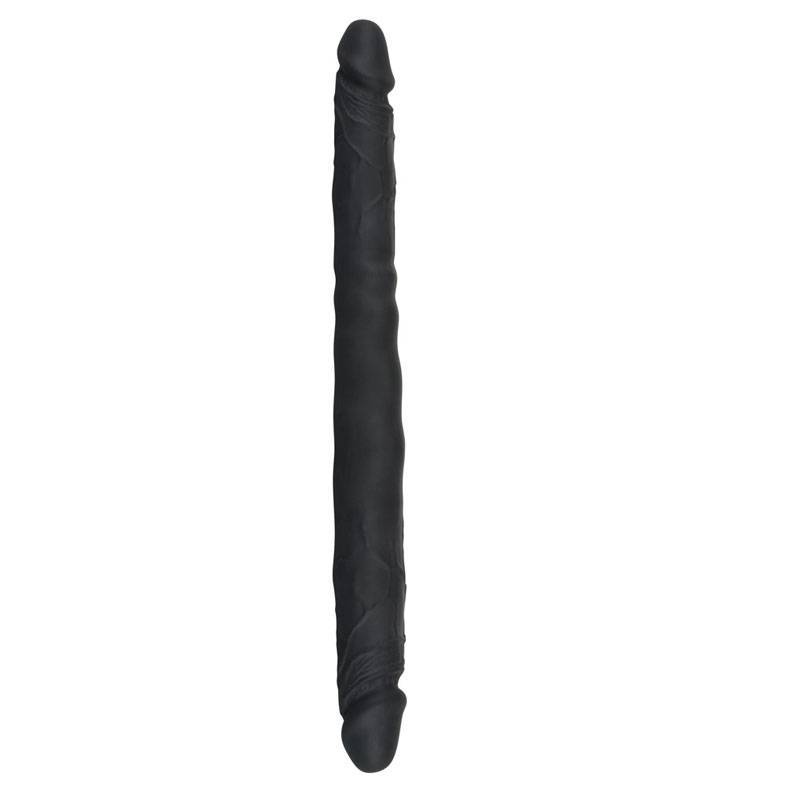 Pene doble de silicona negra ultra flexible, extremadamente suave, estriado para imitar el pene en cada extremo.