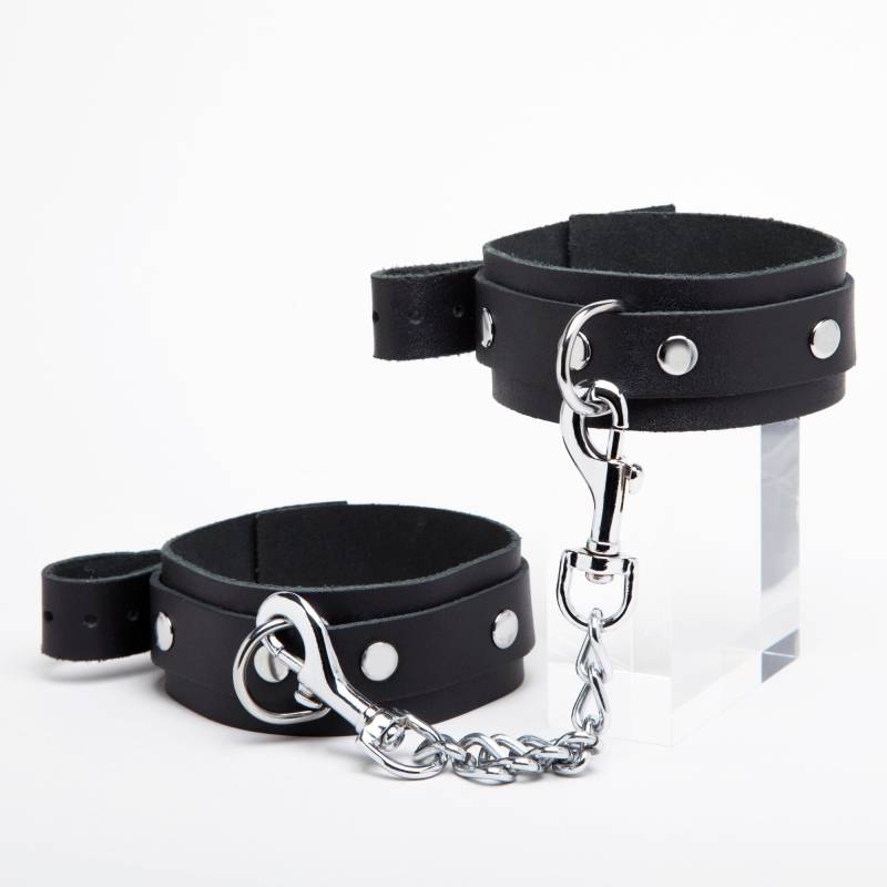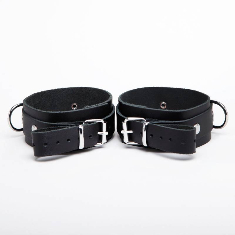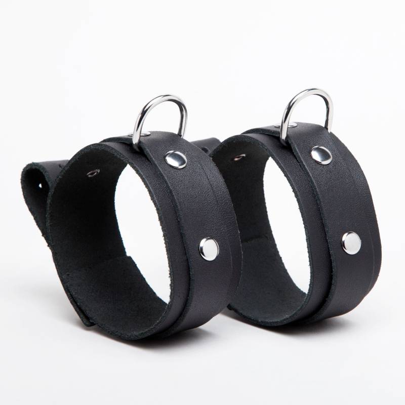 Esposas finas de cuero negro con correas "sur" remachadas y anilla metálica, de lacolección "DEMONIA".