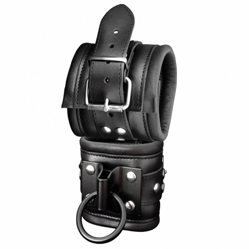 Esposas de cuero negro con bordes acolchados para un confort óptimo. Una correa "over" remachada a las esposas y con 8 orificios para hebillas garantiza un ajuste perfecto sea cual sea el tamaño de su muñeca.