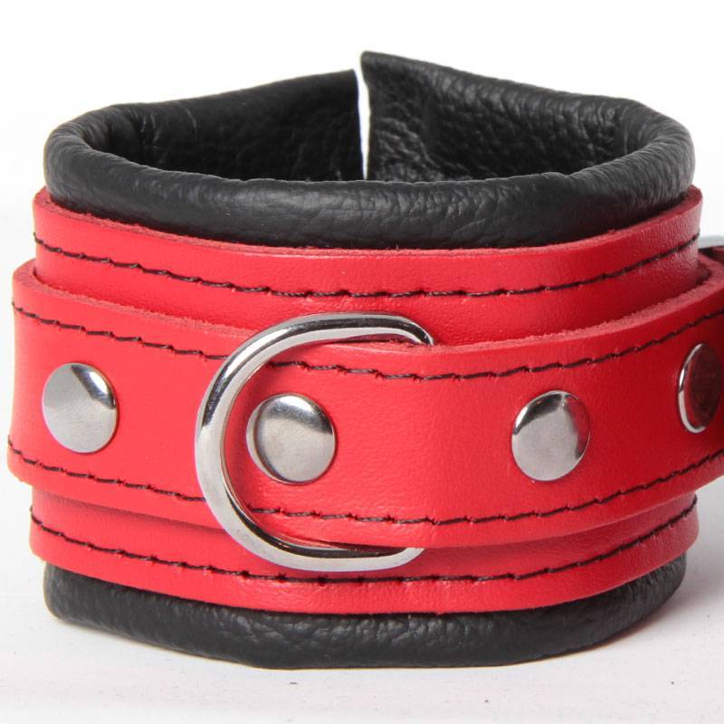 Esposas de cuero rojo de alta calidad con correas remachadas y anilla metálica.