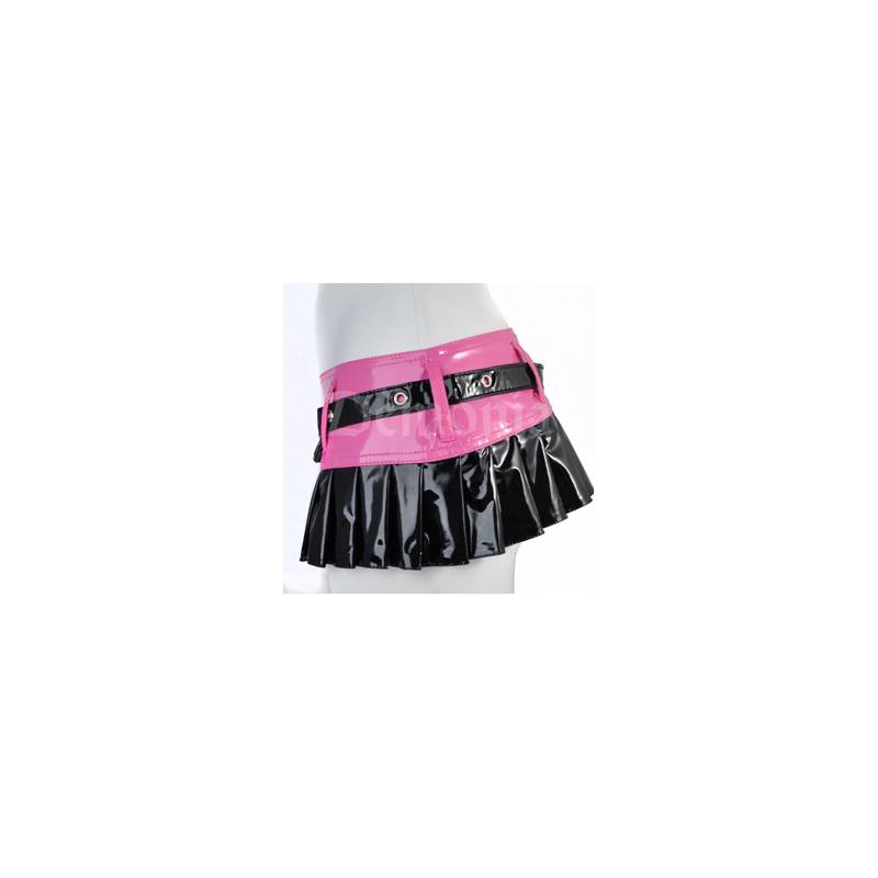 Microfalda rosa con pliegues negros en la parte inferior, cremallera entera en la espalda, 6 trabillas y cinturón negro que pasa por 2 anillas.