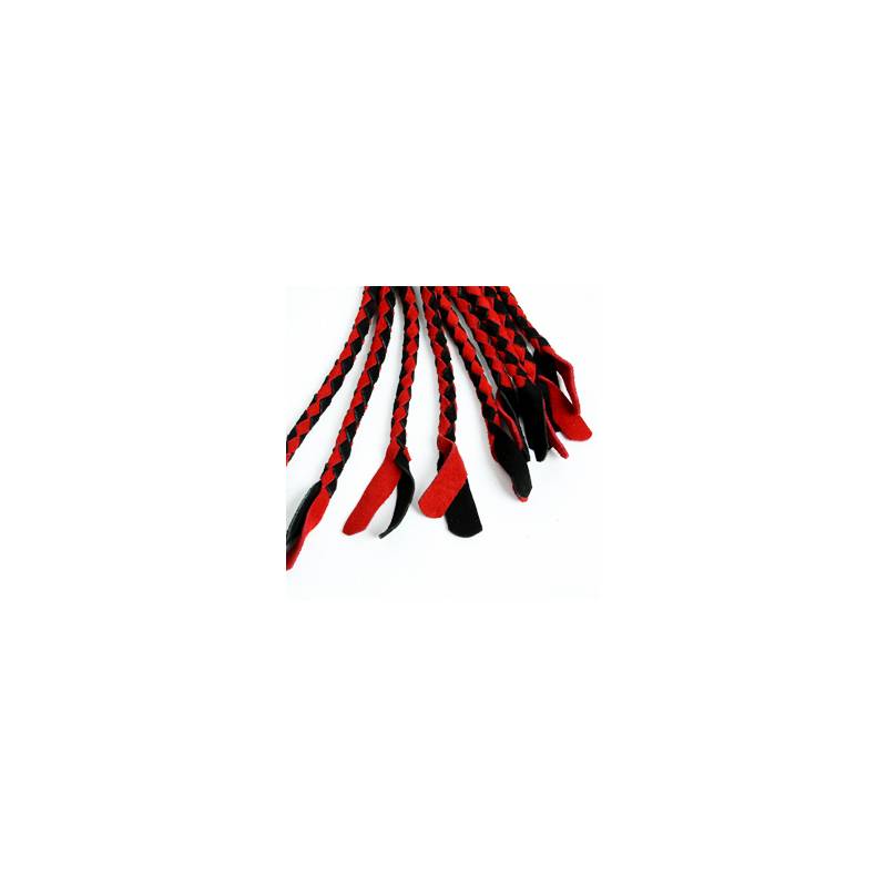 Este bonito Cat O Nine es un vencejo de ante negro y rojo compuesto por nueve correas de ante trenzado. El asa, también de ante, mide 18 cm y termina en una correa.