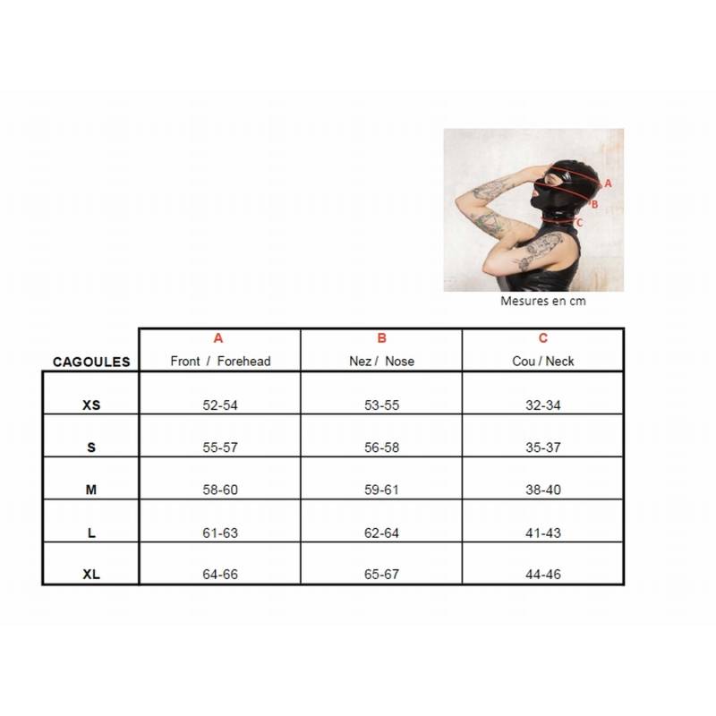 pasamontañas de vinilo negro con aberturas para la boca y los ojos.Cremallera en la parte posterior para cierreDisponible en XS a XLDisponible en rojo