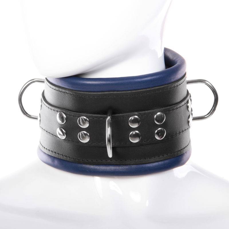 Collar de cuero grueso con forro polar azul oscuro y negro y 3 anillas en una correa remachada.
