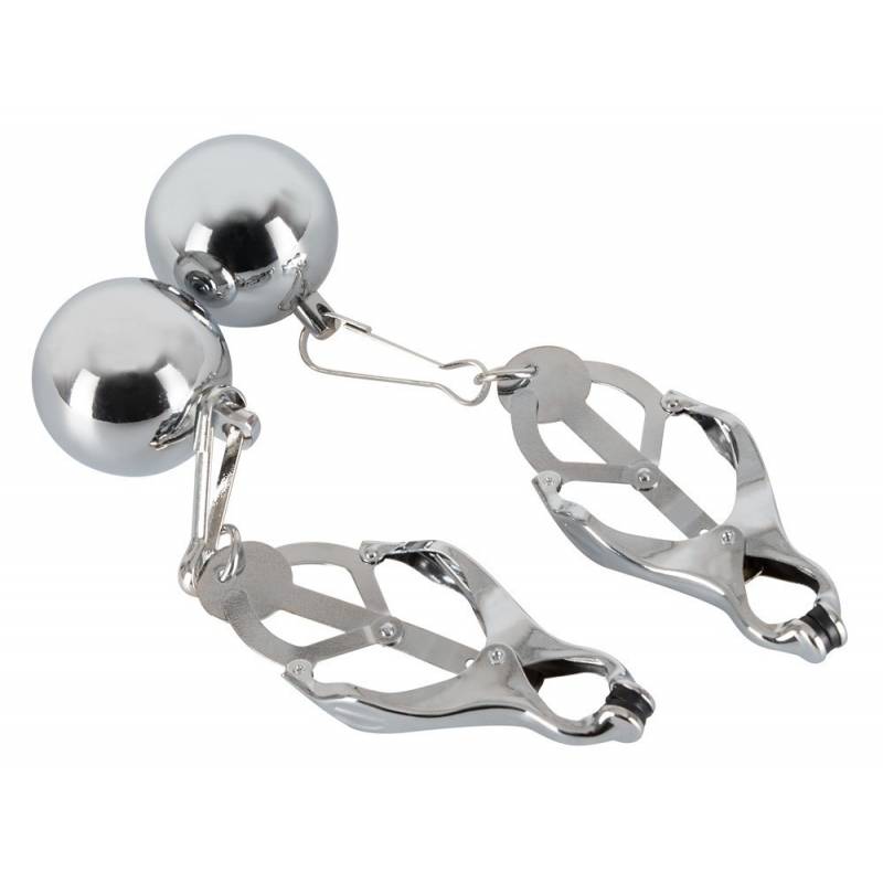 Muy bonitas pinzas de pecho de metal "japonix" con pesos de bola desmontables. Cada bola pesa 250 gr.