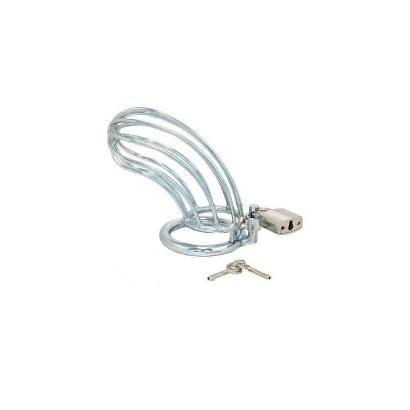 Jaula de castidad metálica con candado metálico para cerrar la jaula.