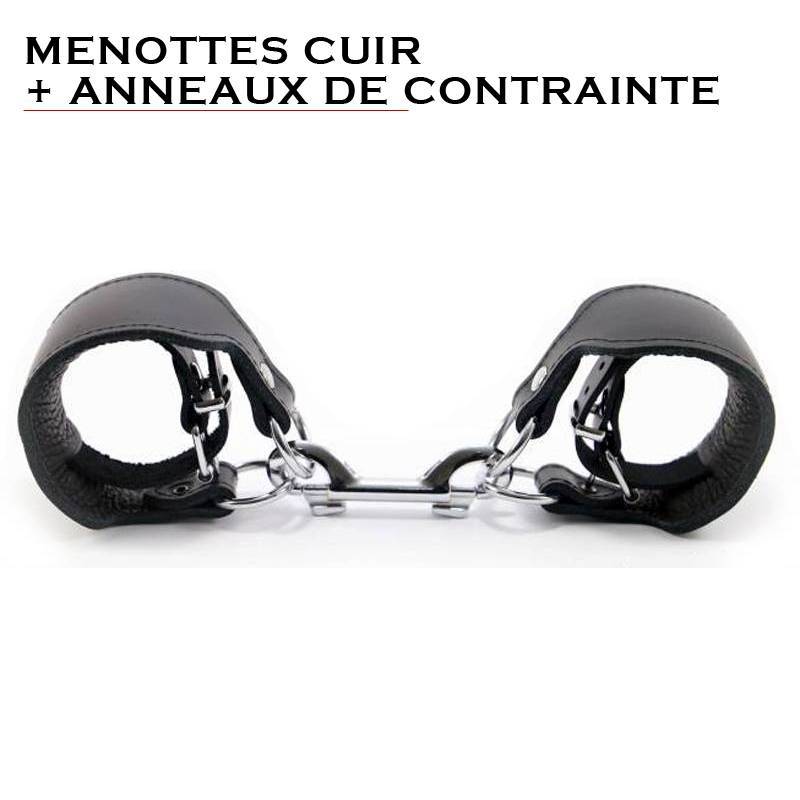 Basadas en el mismo modelo que el collar, finas esposas de cuero negro, ajustables (5 posiciones), insertadas en una pieza más grande de cuero liso en la parte superior, y acolchadas en el interior con un anillo en cada extremo para fijar candados, mosquetones o cualquier otra sujeción de su elección. (¡Mosquetón incluido!)
