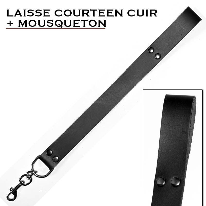 Correa corta (44 cm), en cuero de buena calidad, correa de cuero remachada, anilla metálica y mosquetón.