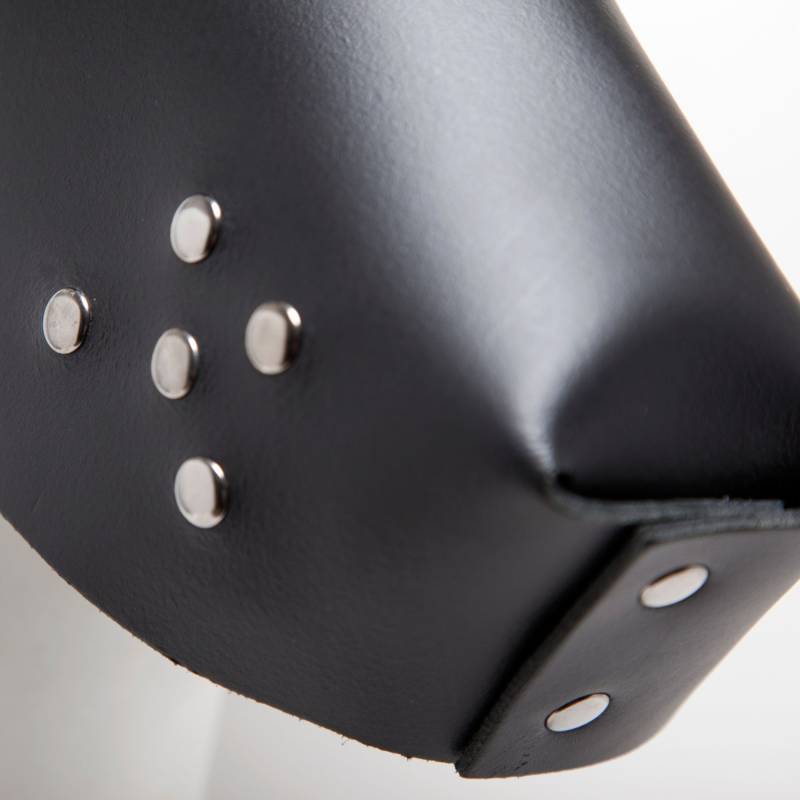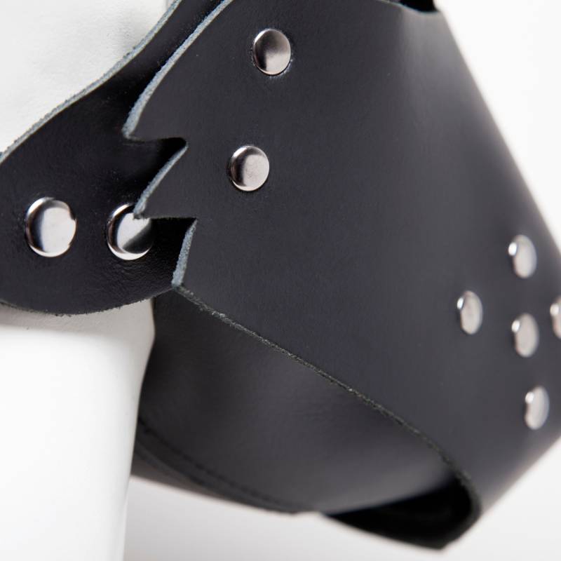 La máscara tiene orejas de cuero y un "hocico" de cuero, ambos unidos a la pieza principal por clavos planos. Su construcción en cuero de varias piezas es a la vez sólida y elegante.