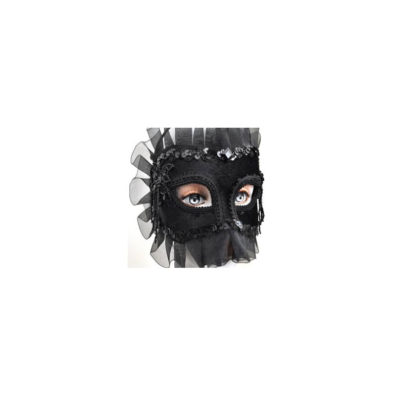 Máscara semirrígida de terciopelo negro con un velo negro con volantes en los bordes, encaje alrededor de los ojos, una flor decorativa de perlas a cada lado, multitud de pequeños discos de plástico alrededor.