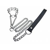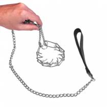 Correa formada por una tira de cuero con anilla remachada, de la que sale una bonita cadena de acero cromado de malla media. En su extremo: ¡un estrangulador de testículos!