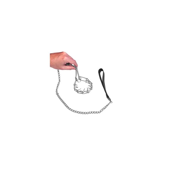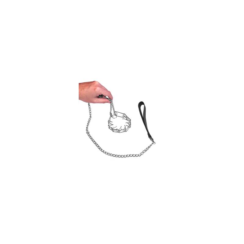 El ahogador de testículos está fabricado como un collar de ahorque, en acero cromado con "dientes" en el interior que se enderezan cuando se tira de la correa, ¡apretando el lazo!