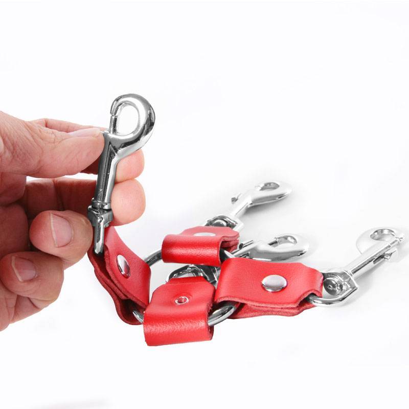 Correa de sujeción cruzada, de cuero rojo liso de alta calidad, con una anilla metálica en el centro y mosquetones en cada extremo, de la"colección Dèmonia".
