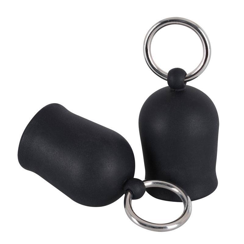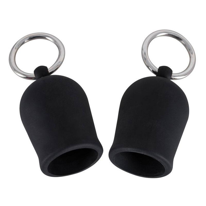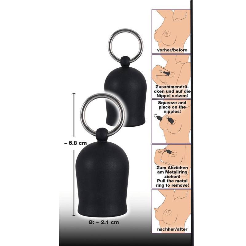 Ventouses pour tétons en silicone noir dotées chacune d'un anneau métal.