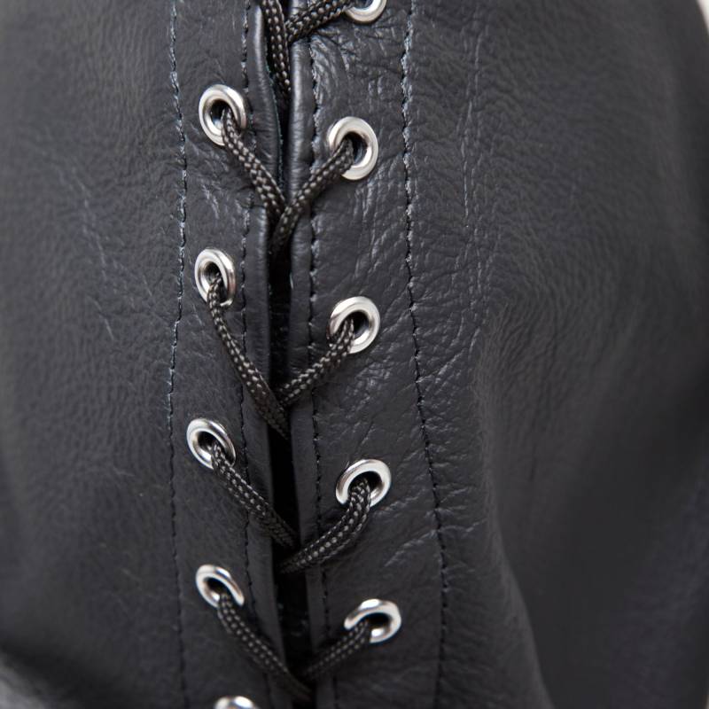 Se cierra por detrás con un cordón, mientras que el cuello de cuero ajustable, cosido directamente al gorro, se sujeta alrededor del cuello. Está adornado con remaches y dos anillas, que añaden un toque de elegancia. Dos ojales a la altura de la nariz facilitan la respiración.