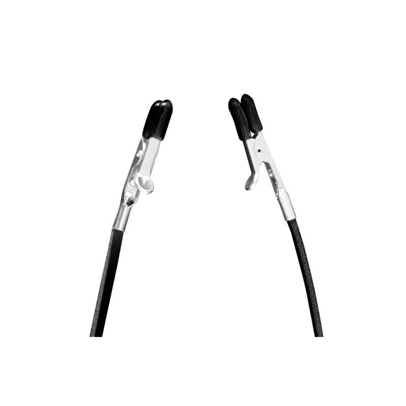 Pinces à seins fines (largeur 0,5cm) avec embout en caoutchouc noir, reliées entre elles par un cordon en cuir souple.