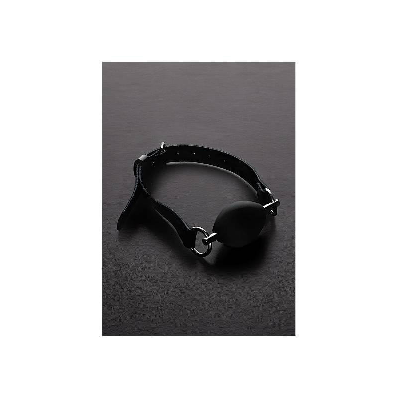 Mordaza de bola ovalada negra de suave silicona con correas ajustables. Cómoda y eficaz, perfecta para juegos BDSM que combinan control y sumisión.