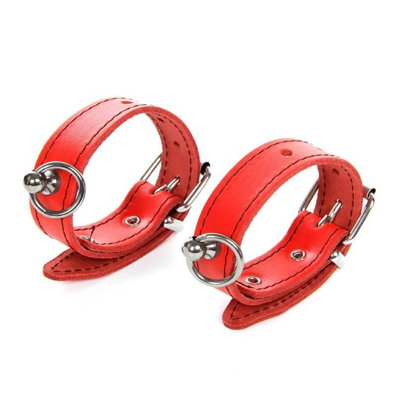 Esposas finas de cuero rojo con una pequeña anilla metálica.
