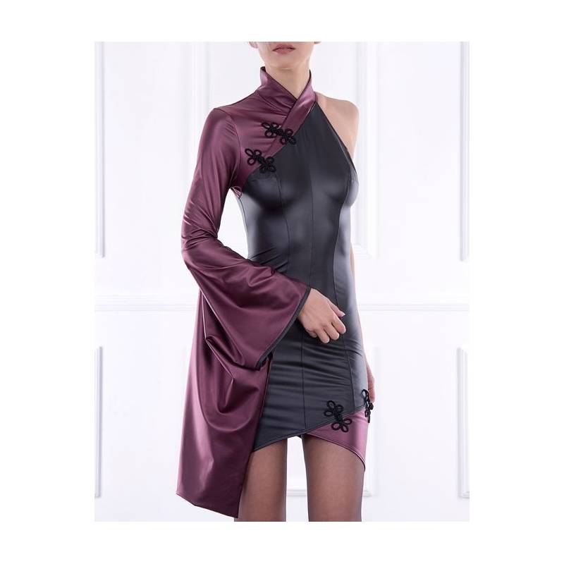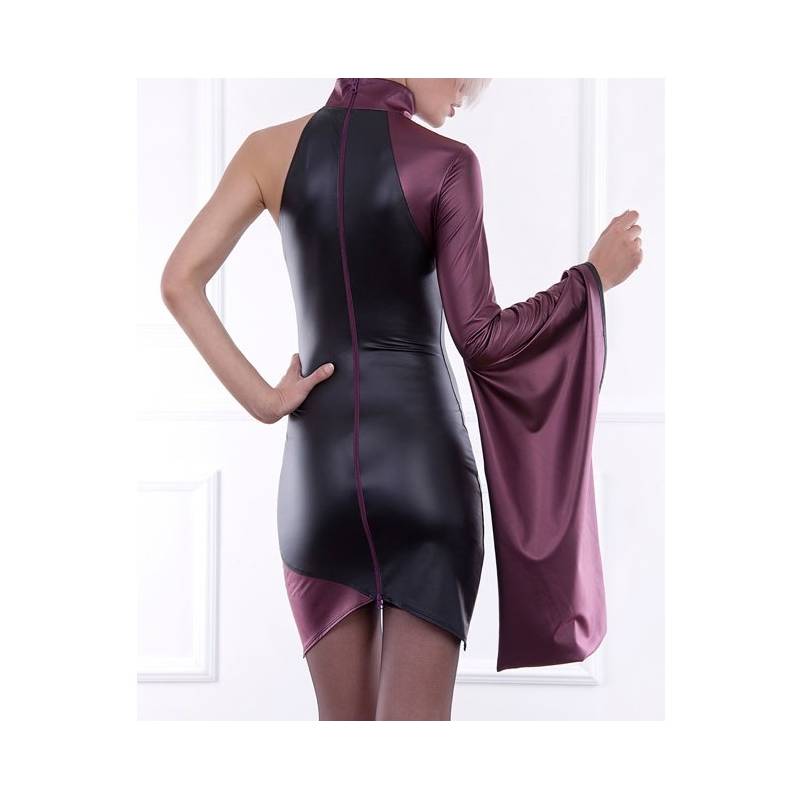 Robe une manche, "Xian", de chez Patrice Catanzaro, réalisée en lycra laqué noir et prune.