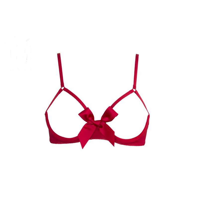 Très joli soutien gorge de la marque Maison Close aux seins ouverts, agrémenté d'un petit noeud amovible à l'avant, l'attache à l'arrière est composé de deux petites lanières. également disponible en noir.