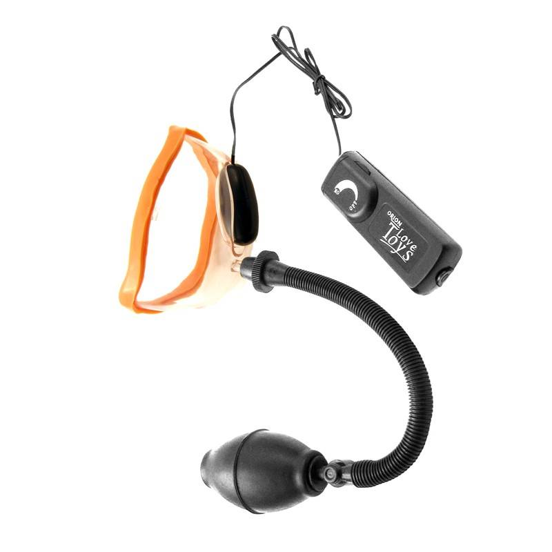 Campana de succión anatómica para la vagina fabricada en plástico rígido transparente con una sección de goma de color carne para un sellado perfecto y un huevo vibrador integrado con regulador y bomba de estimulación continua.