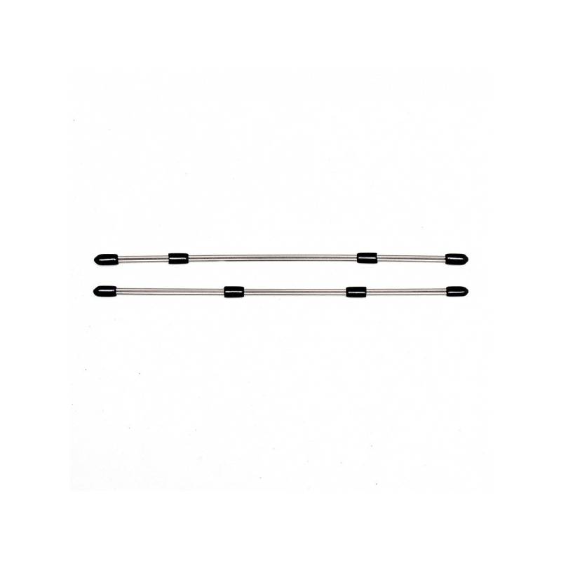 Les barrettes de téton en métal sont constituées de deux longues tiges en métal tenues entre elle à chaque bout par un embout en caoutchouc noir. Sur chacune de ses deux longues tiges courre deux anneaux métal également qui servent à pincer plus ou moins fort le téton.
