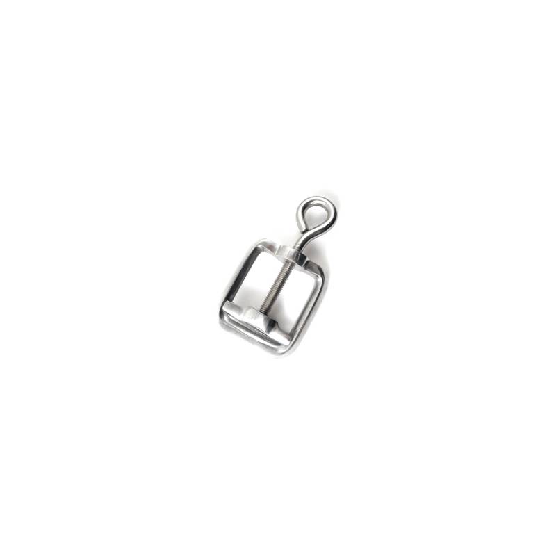 Crucher de penes y pelotas, que consiste en un tornillo de banco para testículos, una varilla con un tornillo y un lazo en su extremo.