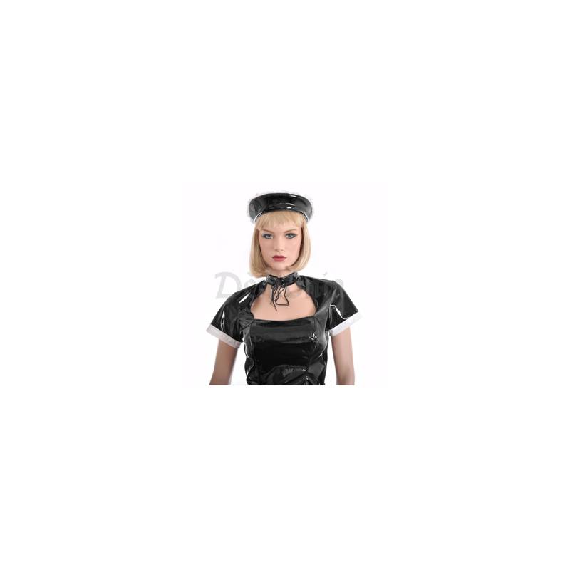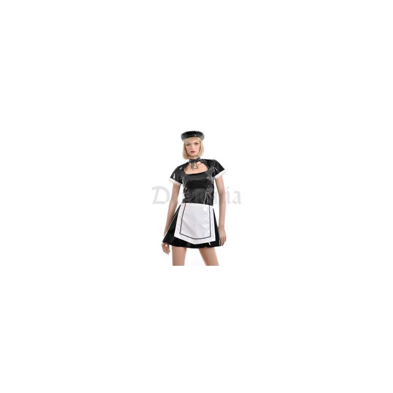 Conjunto compuesto por un vestido corto con mangas cortas, un cuello que se cierra con un cordón, un amplio escote, una cremallera en la espalda, un pequeño delantal de vinilo blanco con 2 cintas que se anudan detrás y una diadema acolchada de vinilo negro con encaje y una cinta elástica.