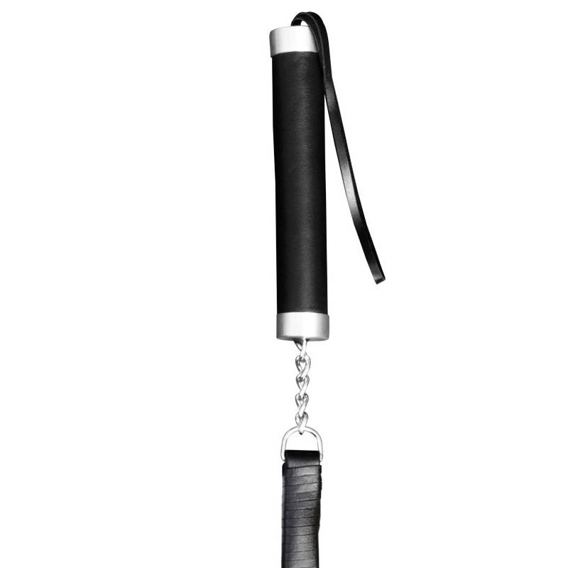 Martinet en cuir avec 16 lanières en cuir dur. Le manche est relié par une chaine métal à une poignée réalisée en métal et cuir.