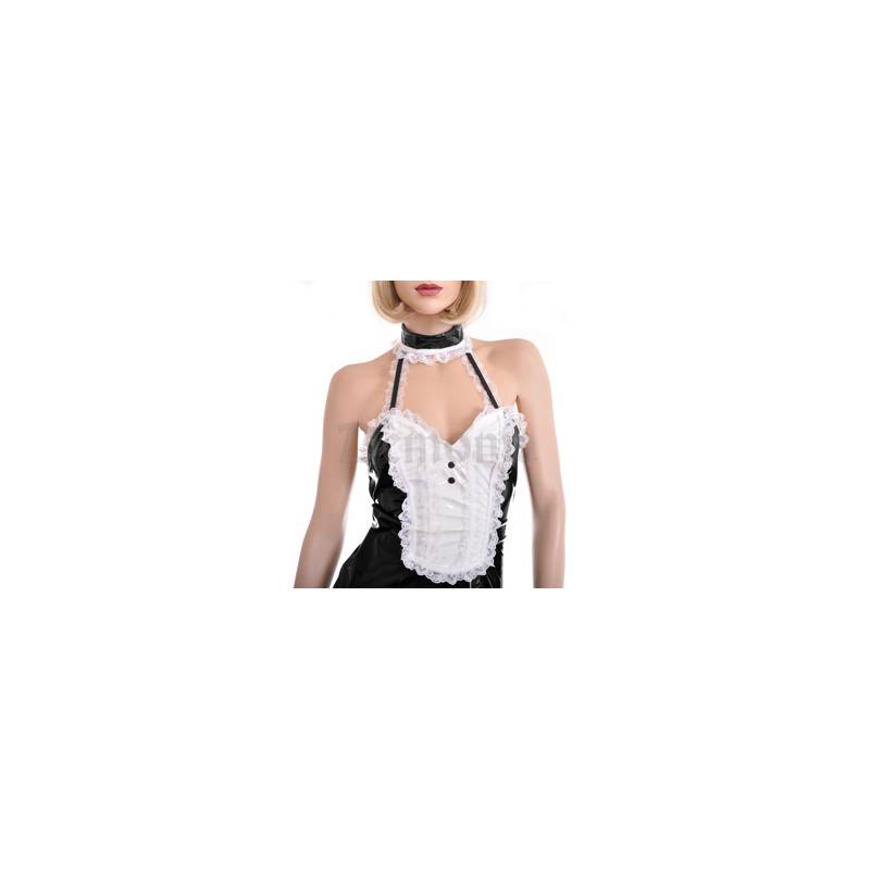 Robe de soubrette dos nu noire et blanche en vinyle avec un zipdans le dos et 2 rubans élastiques ainsi qu'un col en vinyle etdentelle réglable par pression.