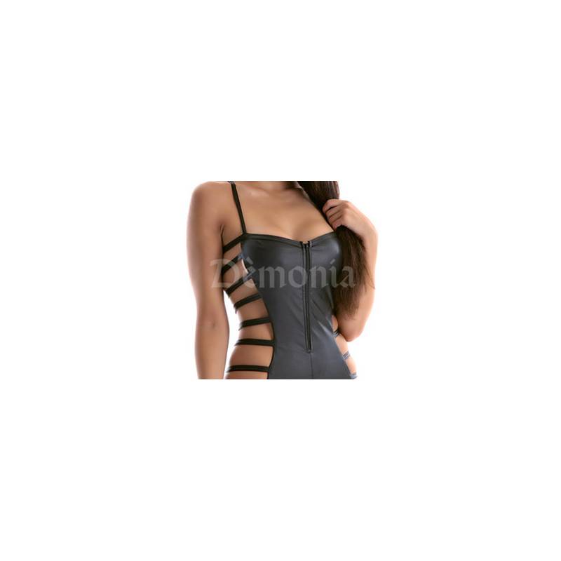 Robe courte avec empiècements en wetlook devant et au dos, ouverte de chaque coté avec toute une série de bandes pour un effet ultra sexy et graphique qui accompagne et sublime vos courbes