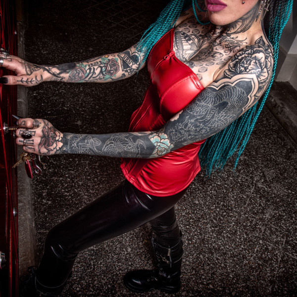 Affirme ta dominance avec éclat.Brassière en Datex rouge et noir ultra-brillant Coupe courte à décolleté plongeant et larges bretelles Maintien sensuel et design graphique sculptant Confortable, extensible, facile à enfiler (sans talc ni lubrifiant) Fabrication française – Maison Catanzaro