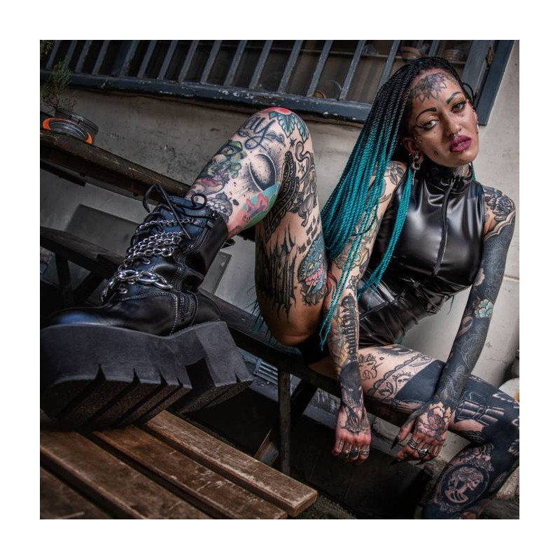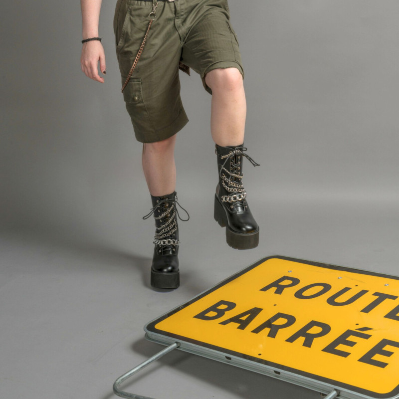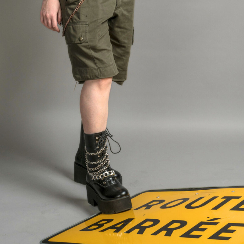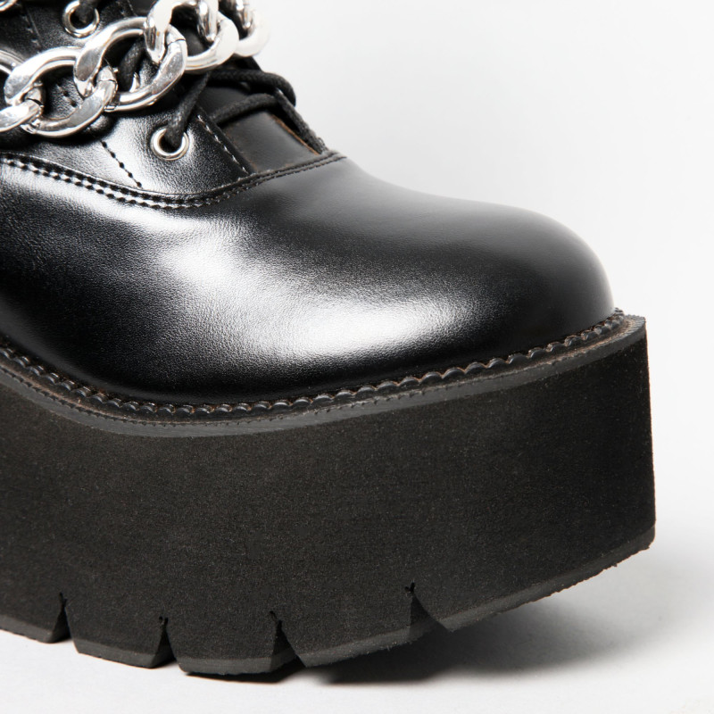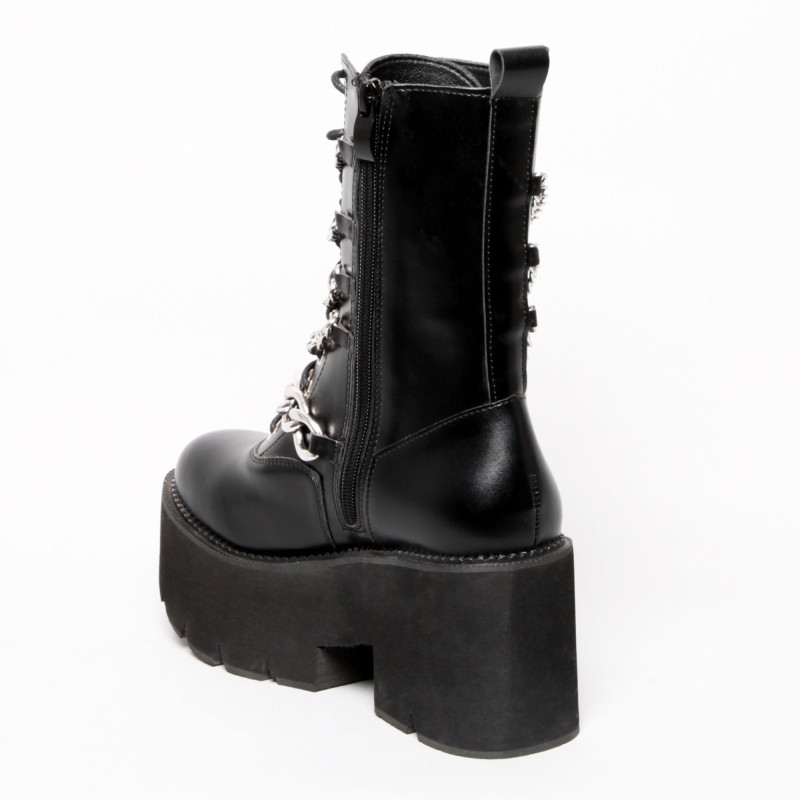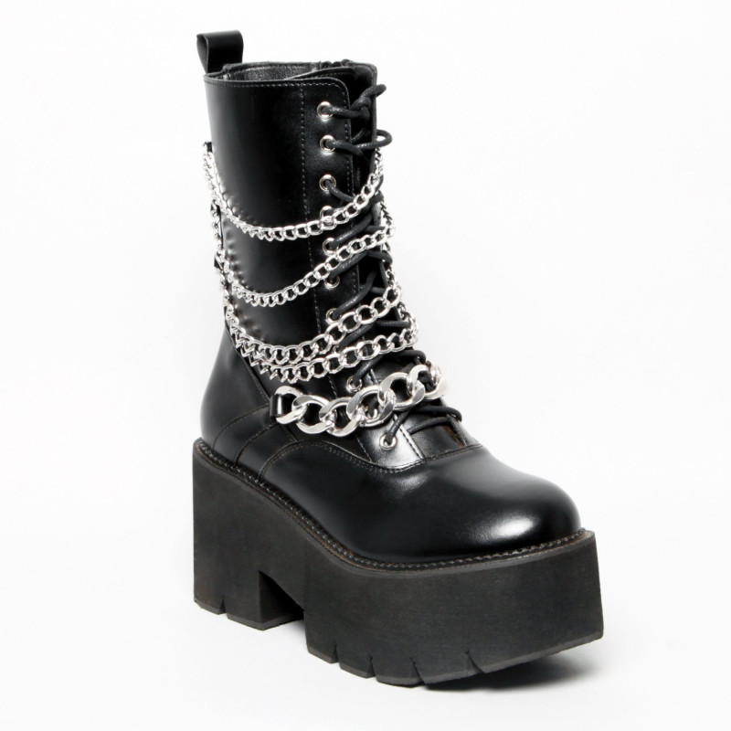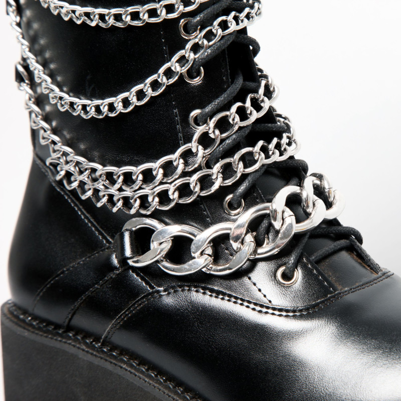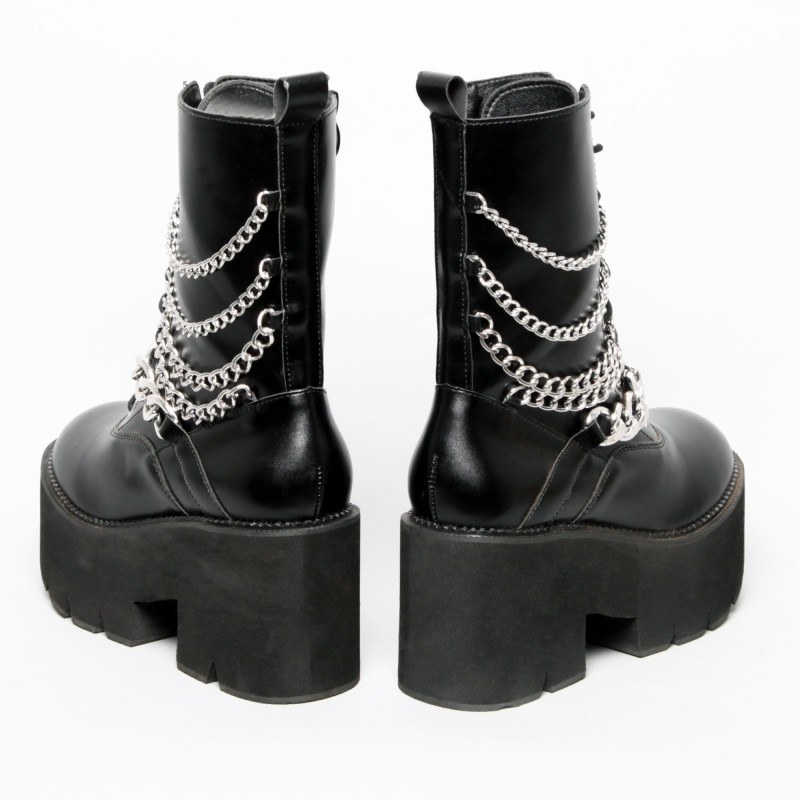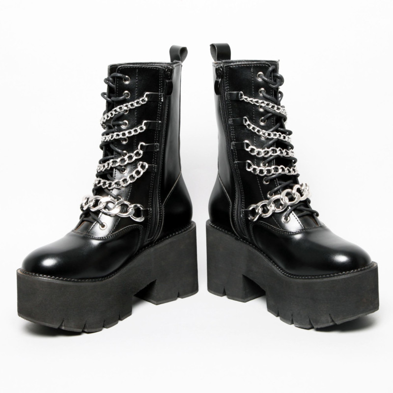 Plongez dans l'obscurité avec ces bottes gothiques uniques, ornées de chaînes en métal qui ajoute une touche de sophistication à votre look sombre.