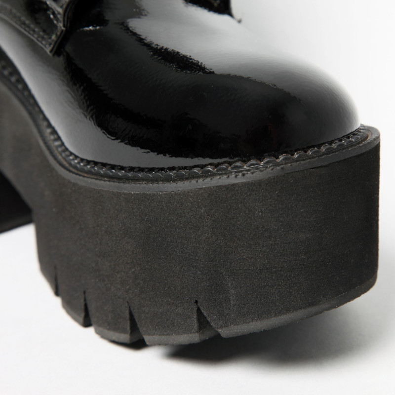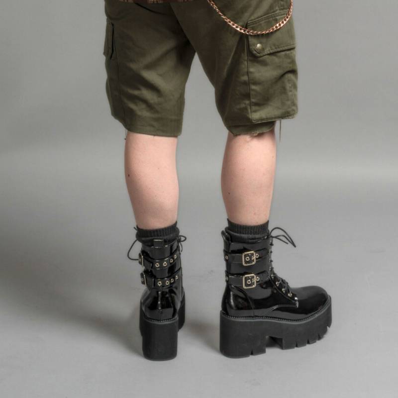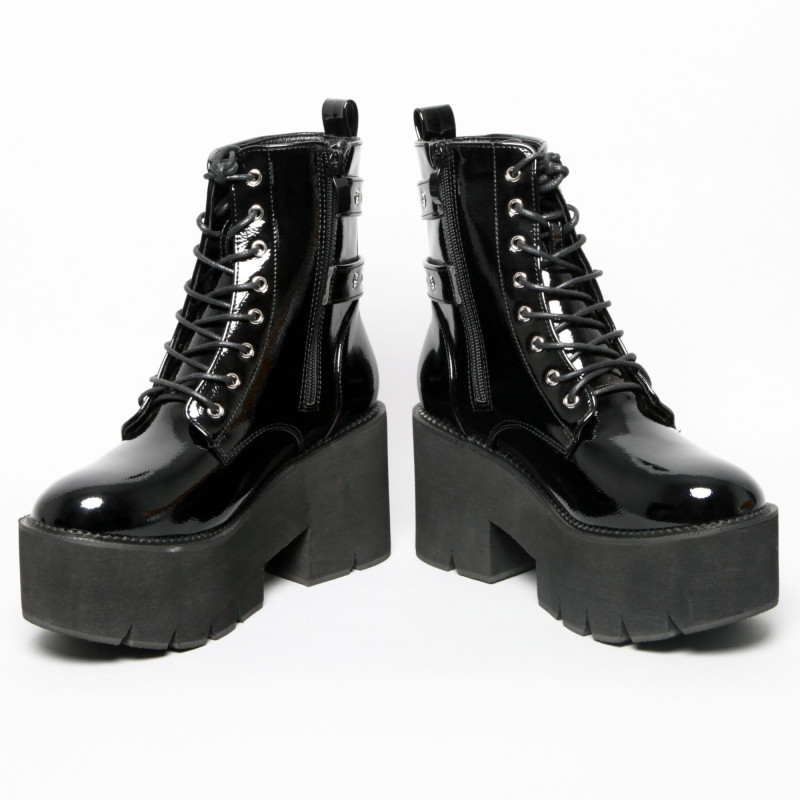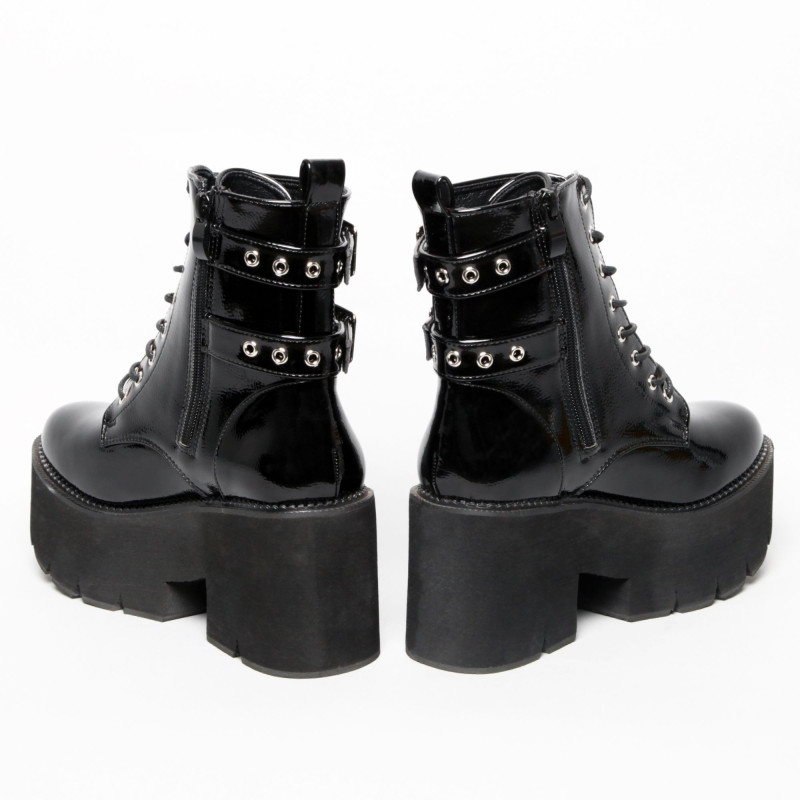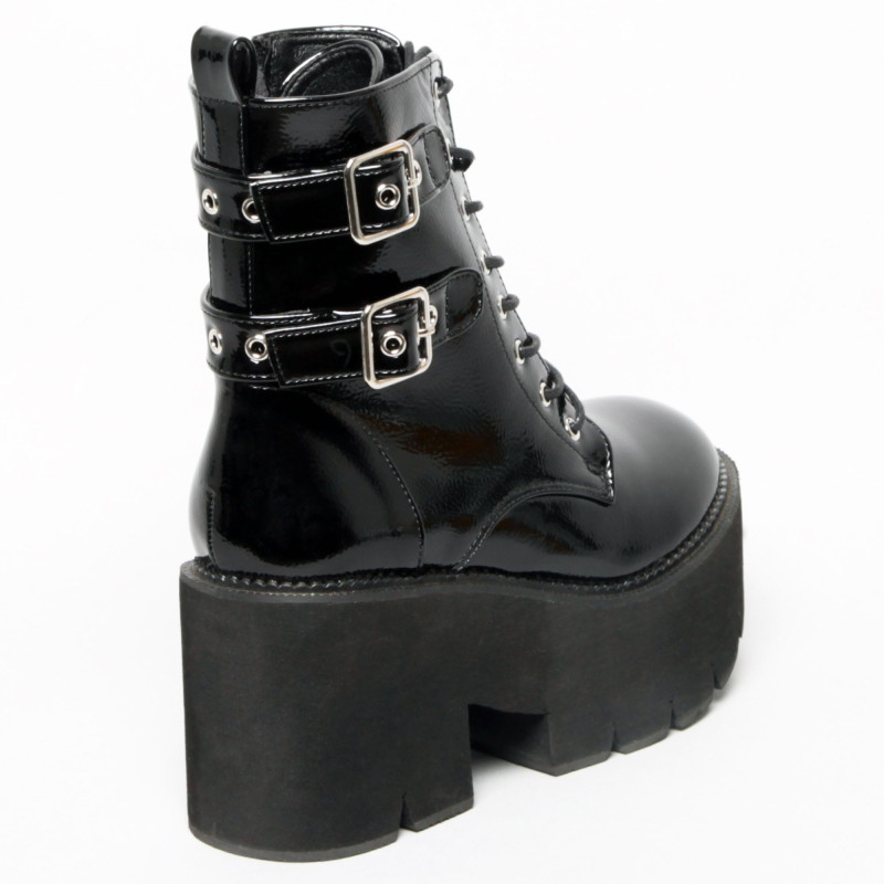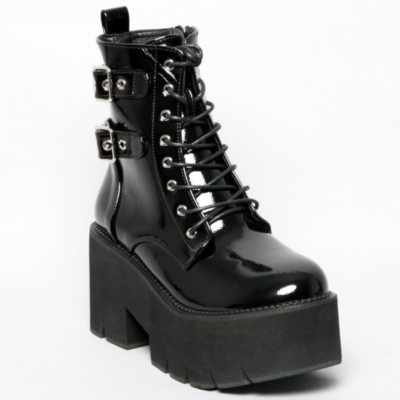 Découvrez notre botte plateforme vinyle avec double boucle attache en métal et fermeture éclair, le choix parfait pour un look audacieux et branché. Pour un look gothique, original et la fermeture éclair en métal ajoutent une touche industrielle.