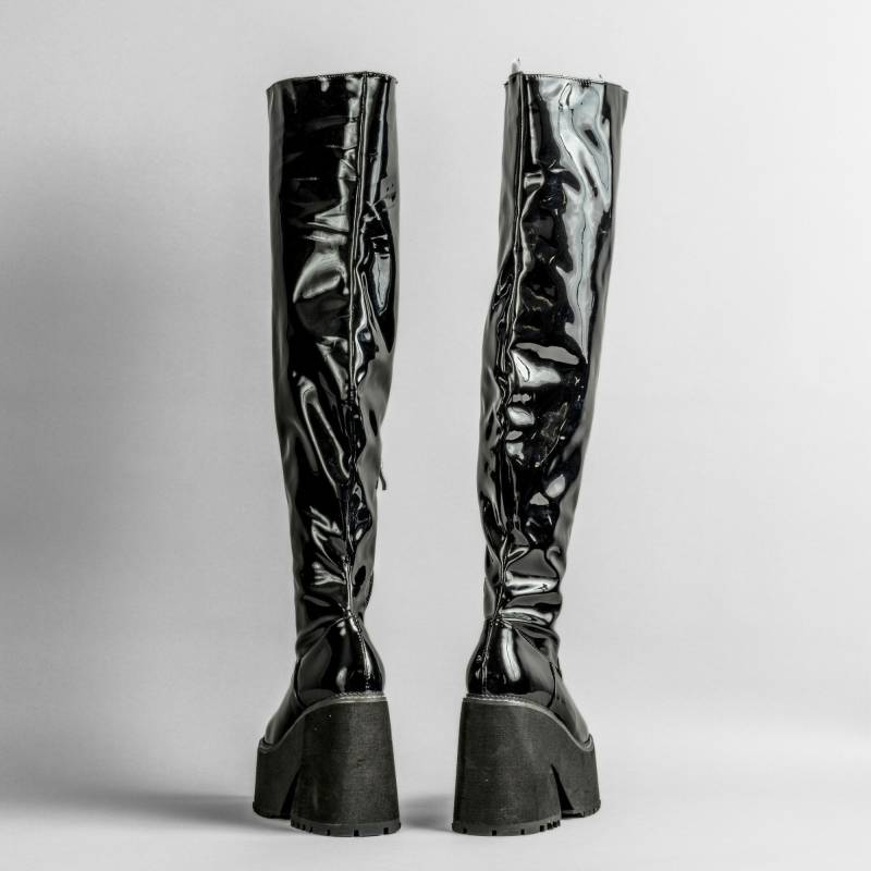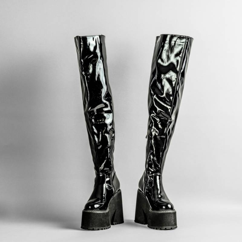 Les Ania sont des bottes imposantes et audacieuses, parfaites pour un style gothique affirmé. Montant jusqu’à la cuisse, elles offrent une plateforme de 6 cm et un talon de 12 cm en caoutchouc, créant une silhouette élancée et puissante. Le vinyle noir brillant leur confère un look unique et accrocheur, idéal pour celles et ceux qui veulent se démarquer dans la mode alternative.