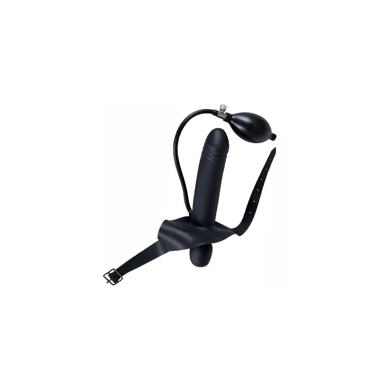 Bâillon composé d'un gode sur la partie extérieur et d'une boule gonflable sur la partie intérieur.